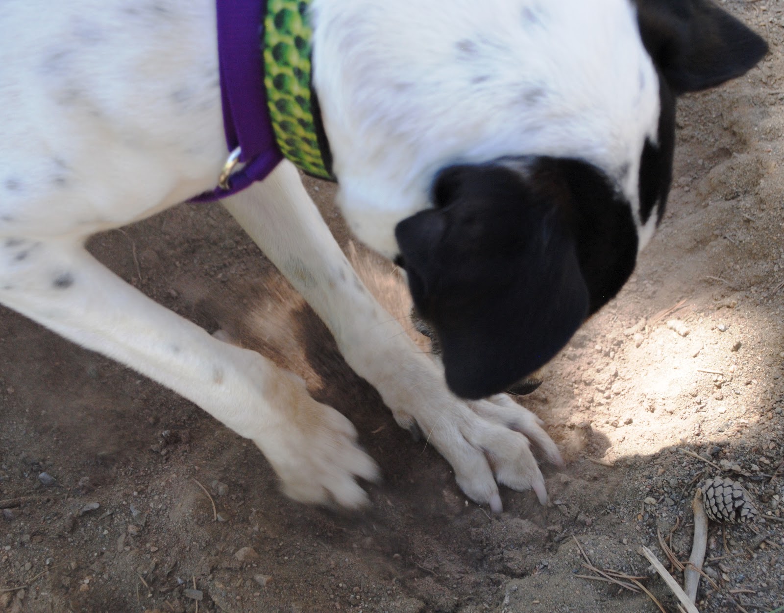 When we got back to the campsite, everyone started getting things ready for dinner. Eva, however, started doing something strange. She started pushing dirt into her food dish with her nose. We couldn't figure out WHY she was doing this; why would a dog want to eat dirty food? Steve looked it up later and read that dogs bury their food for later when they're in the wild. Instinct is a strong habit to break. Then Eva started digging a hole near the chair where Nikki was sitting. We weren't sure why she was doing that either.